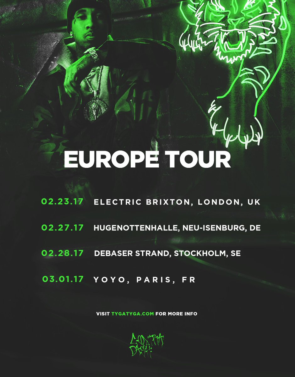 Tyga has announced dates for his upcoming European tour. The West Coast rapper will make his first stop in London, kicking off on Feb. 23. https://t.co/3YJKpw1V5e pic.twitter.com/pNprAIOLpt — T-Raww (@Tyga)…