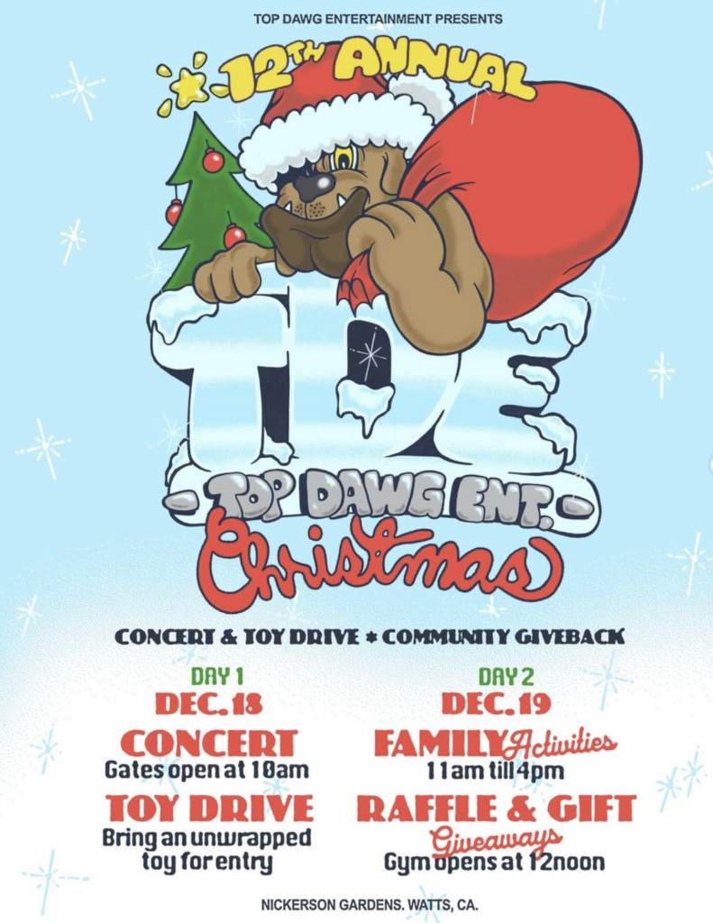 Top Dawg Entertainment is once again giving back to Watts, the city of Los Angeles with the announcement of its highly anticipated Annual Christmas Toy Drive, a tradition that has become one of the city’s most beloved community events for the past 12 years.